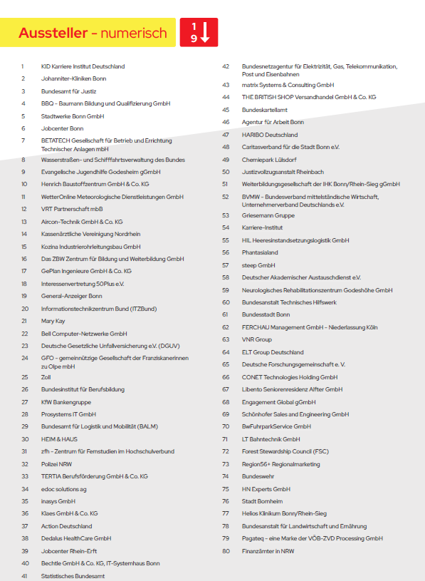 Der Bonner Karrieretag versammelt renommierte Aussteller aus Bonn und der Umgebung, die Sie gerne mit Informationen und Tipps rund um Ihre Karriereplanung versorgen.